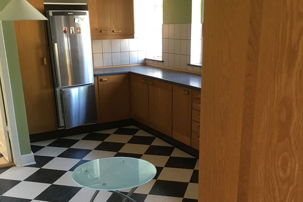 Køkkenet har gennemgået en fuld forvandling med nedrivning af væg og nye elementer.